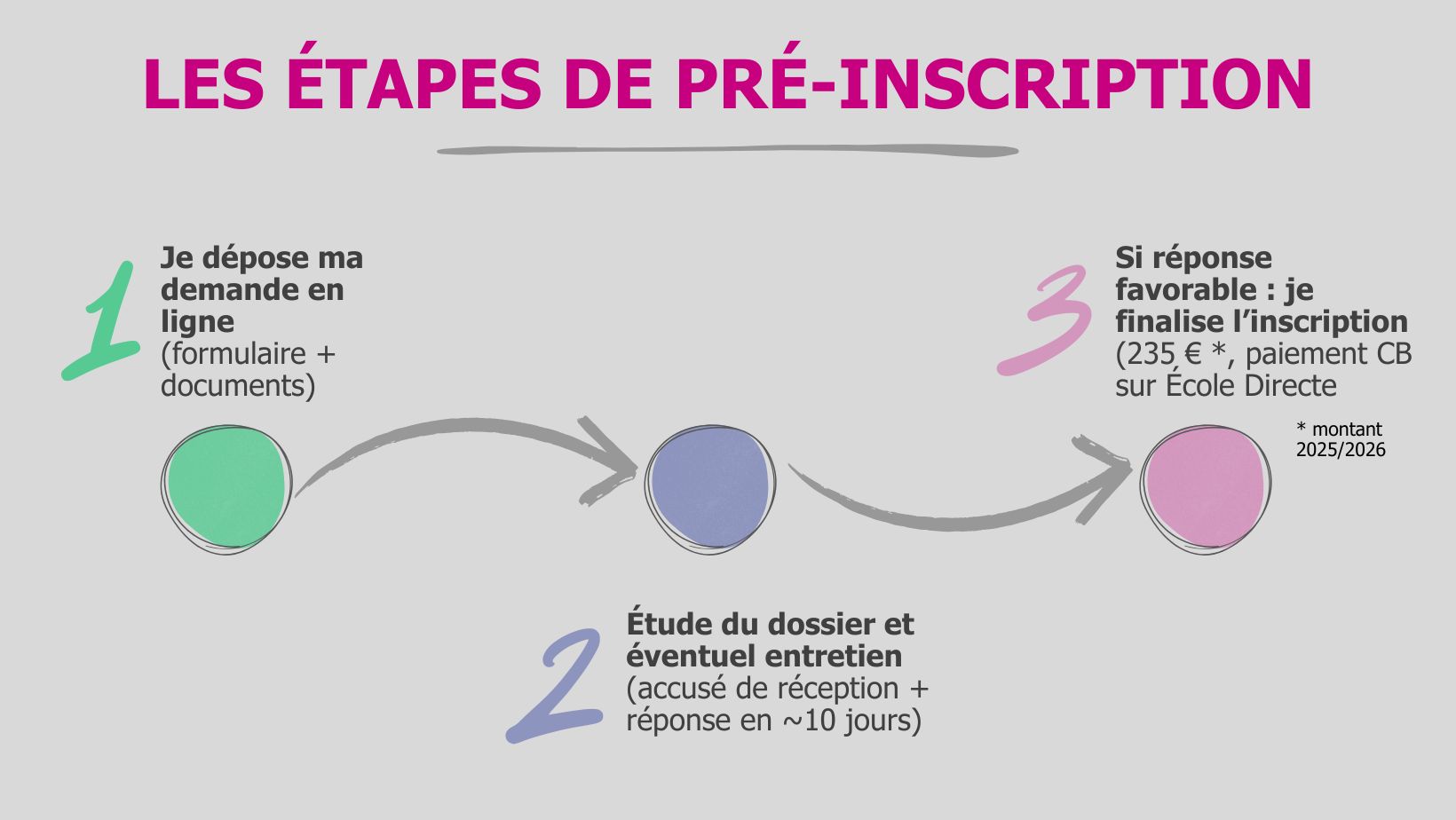 - Étape 3 : Si réponse favorable : je finalise l’inscription (235 € – montant fixé pour l’année 2025-2026 – paiement CB sur École Directe)