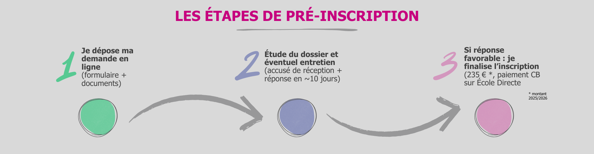 - Étape 3 : Si réponse favorable : je finalise l’inscription (235 € – montant fixé pour l’année 2025-2026 – paiement CB sur École Directe)